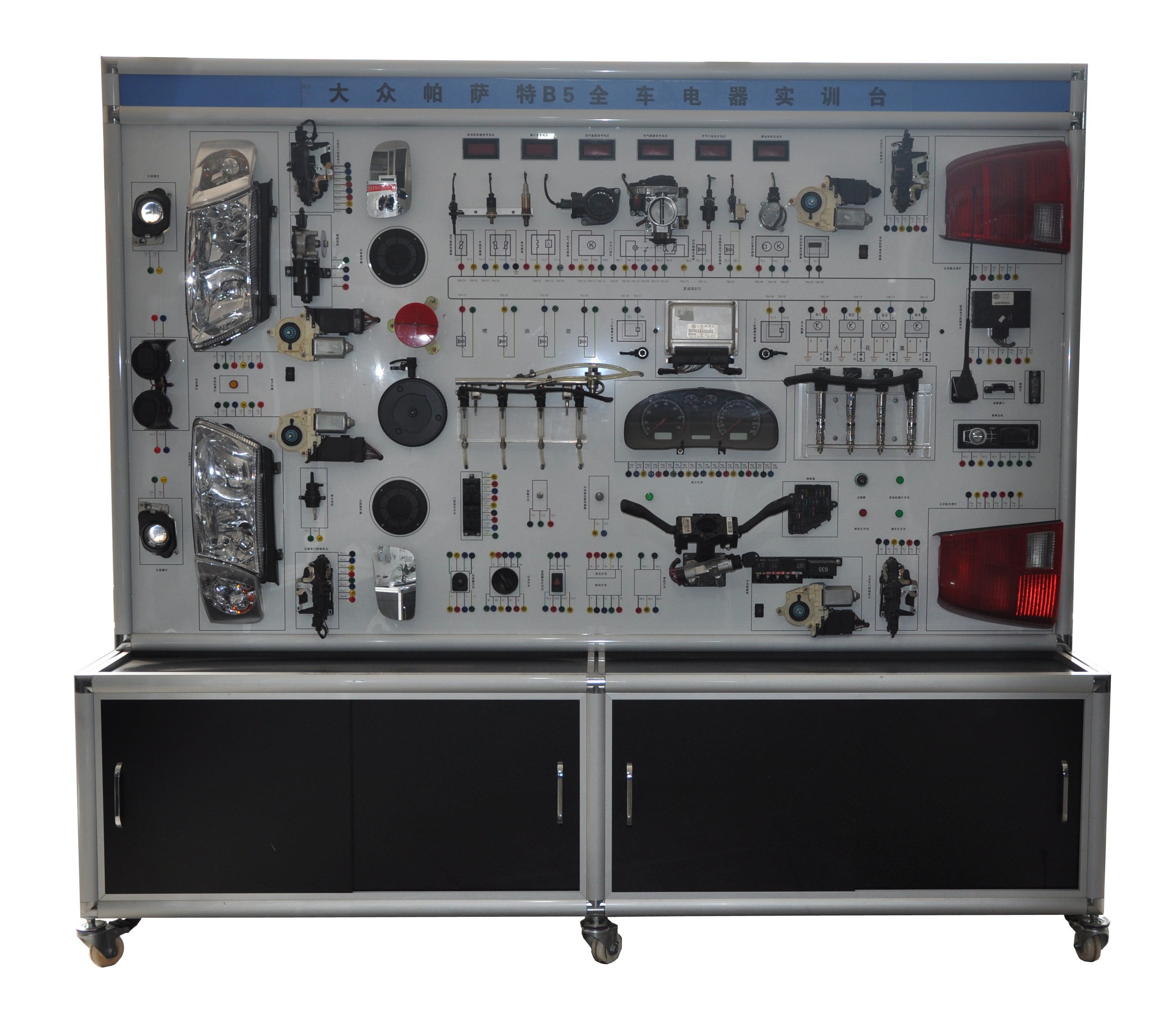 2、配置包括:燈光、音響、儀表、雨刮系統(tǒng);充電、起動。冷卻系統(tǒng);電動門窗、中控門鎖、電動后視鏡、中央接線板、進氣、點火噴油系統(tǒng)實現(xiàn)動態(tài)演示;防盜、發(fā)動機電控系統(tǒng)傳感器實現(xiàn)動態(tài)顯示;電機驅(qū)動控制系統(tǒng),電源系統(tǒng),OBDII診斷接口、故障設置系統(tǒng)、測量面板和移動支架等