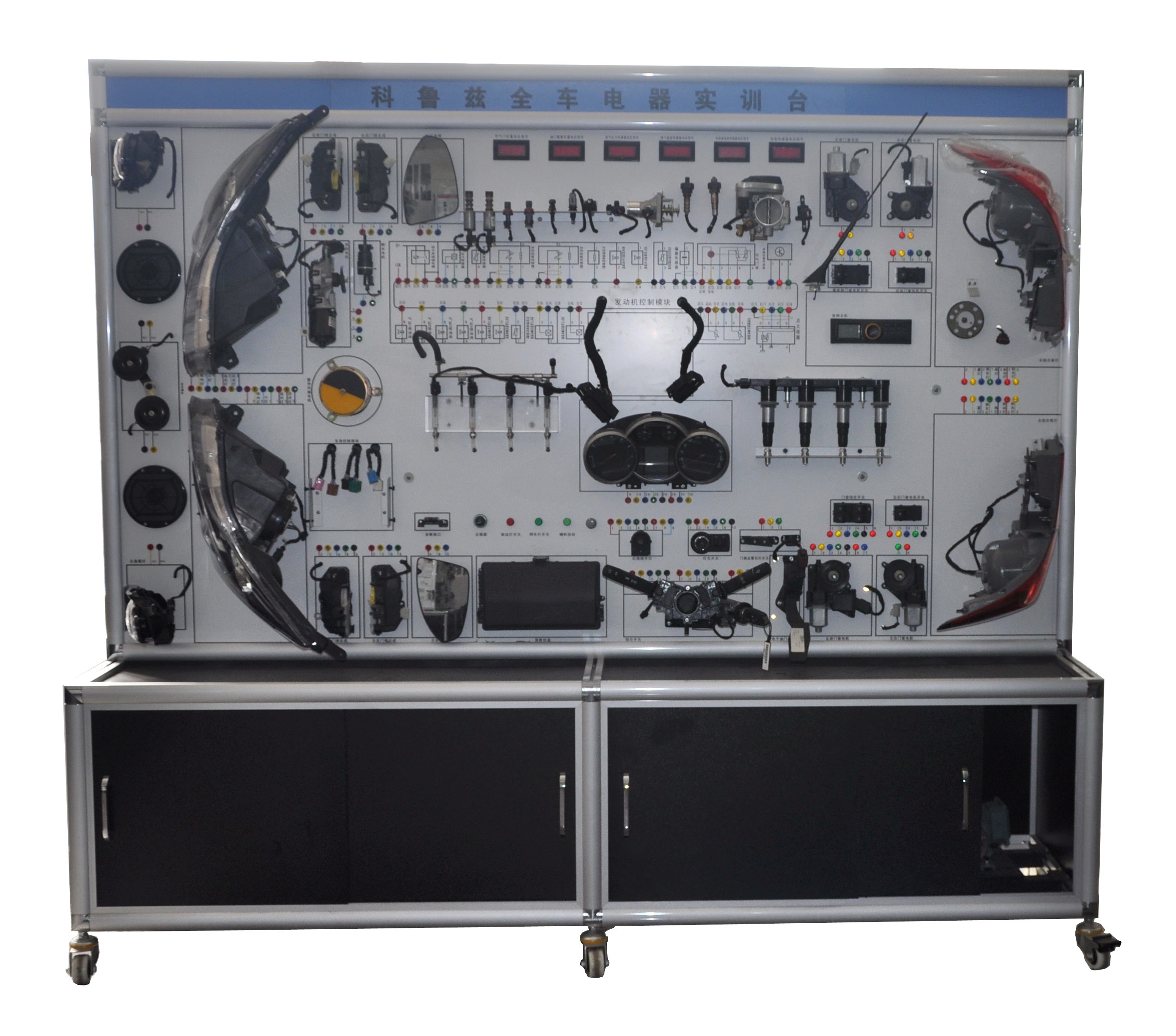 4. 實(shí)訓(xùn)臺面板上安裝有檢測端子,可直接在面板上檢測汽車車身電器系統(tǒng)各電路元件的電信號,如電阻、電壓、電流、頻率信號等。